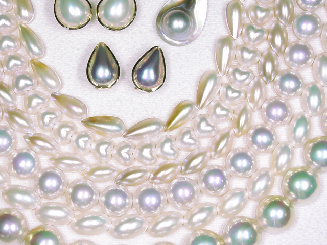 「マベパール」最大の特徴は、半円形の「半円真珠」であること。「マベ」の身は非常に大きく筋肉質のため、養殖に必要な「核」を体内に包み込むゆとりがなく、「核」を入れても大半は体外に吐き出してしまいます。そのため、「半円形の核」を貝殻の内側に接着して養殖する方法をとることとなりました。半円形の特徴を生かして、円形(丸形)だけでなく、ドロップ(雫)やハートなど様々な形状の真珠を育てることができます。